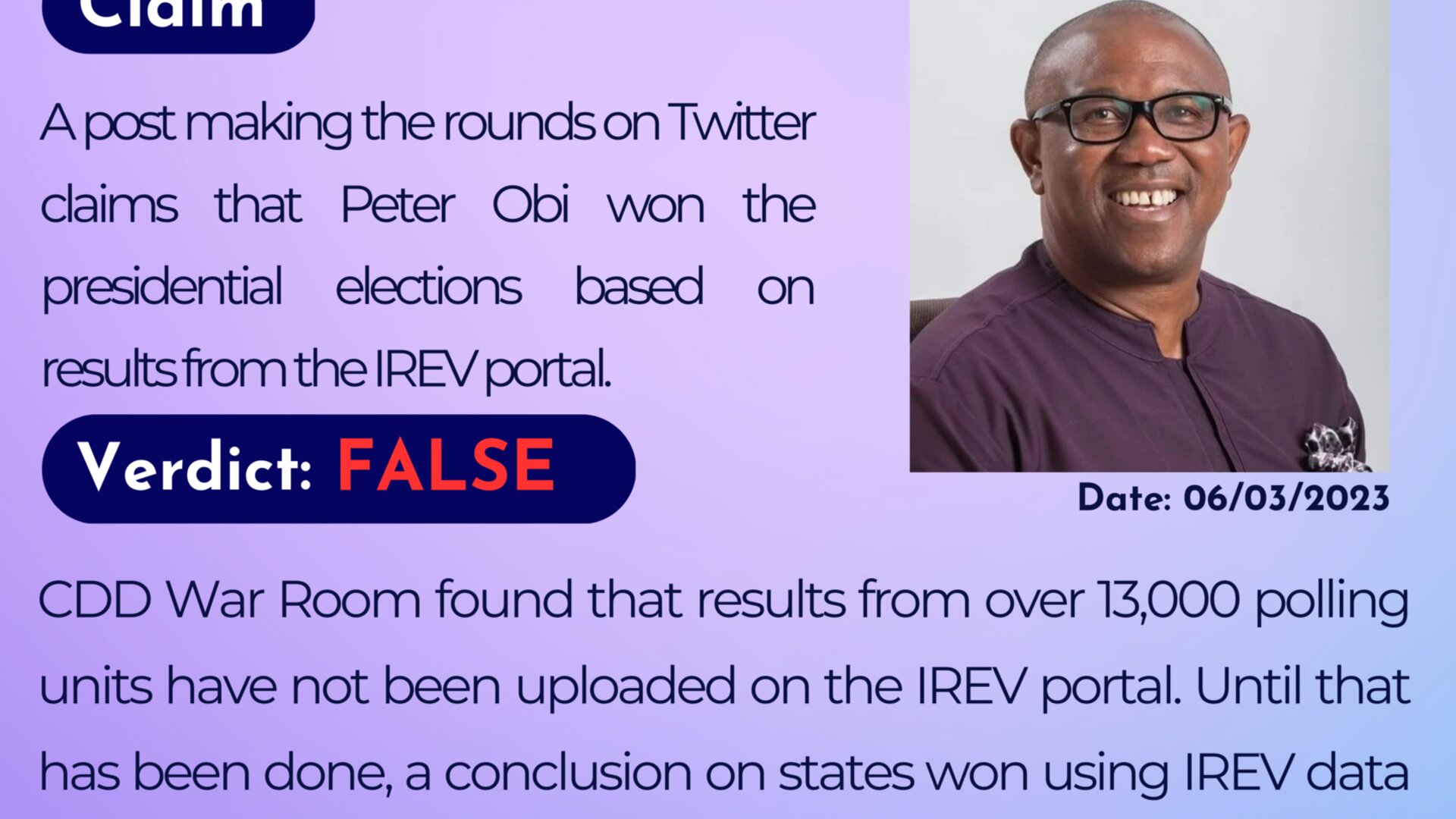 A post making the rounds on Twitter claims that Peter Obi won the presidential elections based on results from the IREV portal.