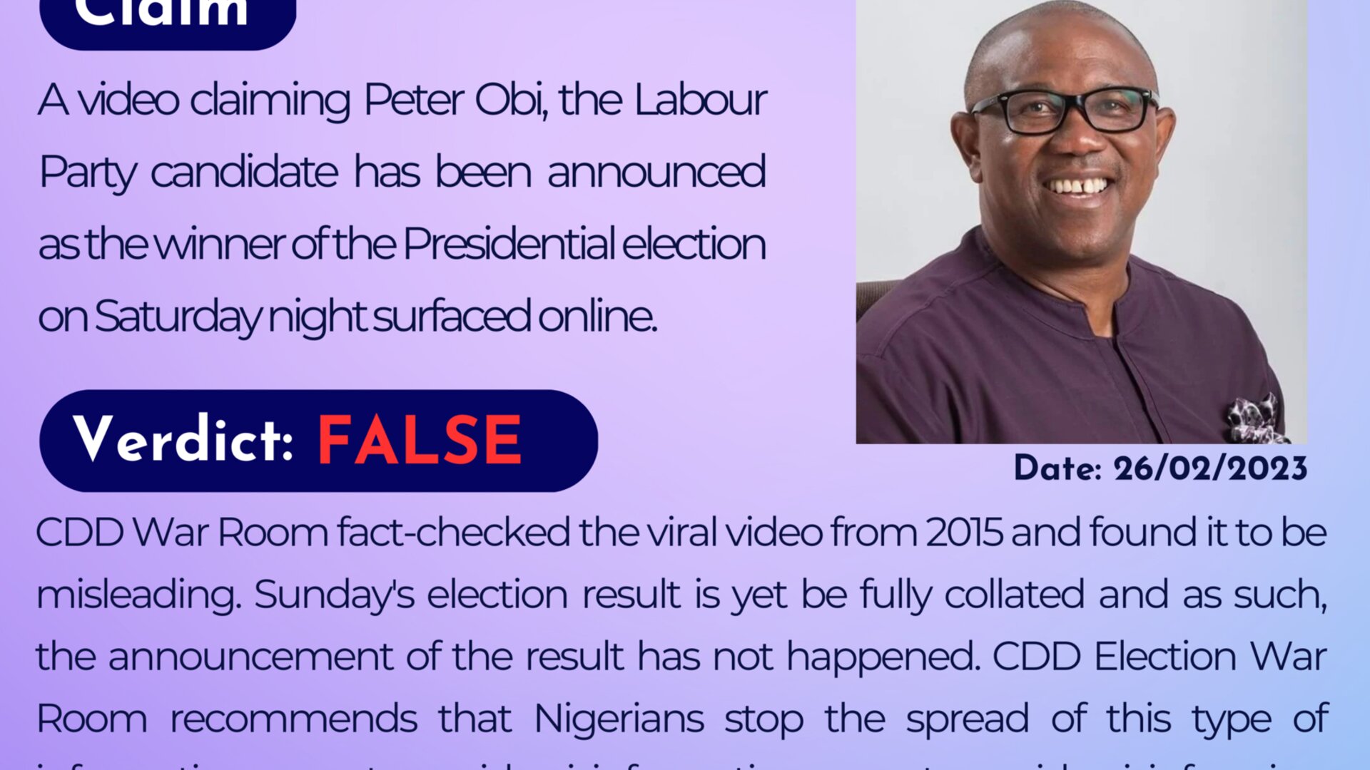 A Video claiming Peter Obi, the Labour Party candidate has been announced as the winner of the Presidential election on Saturday night surfaced online.