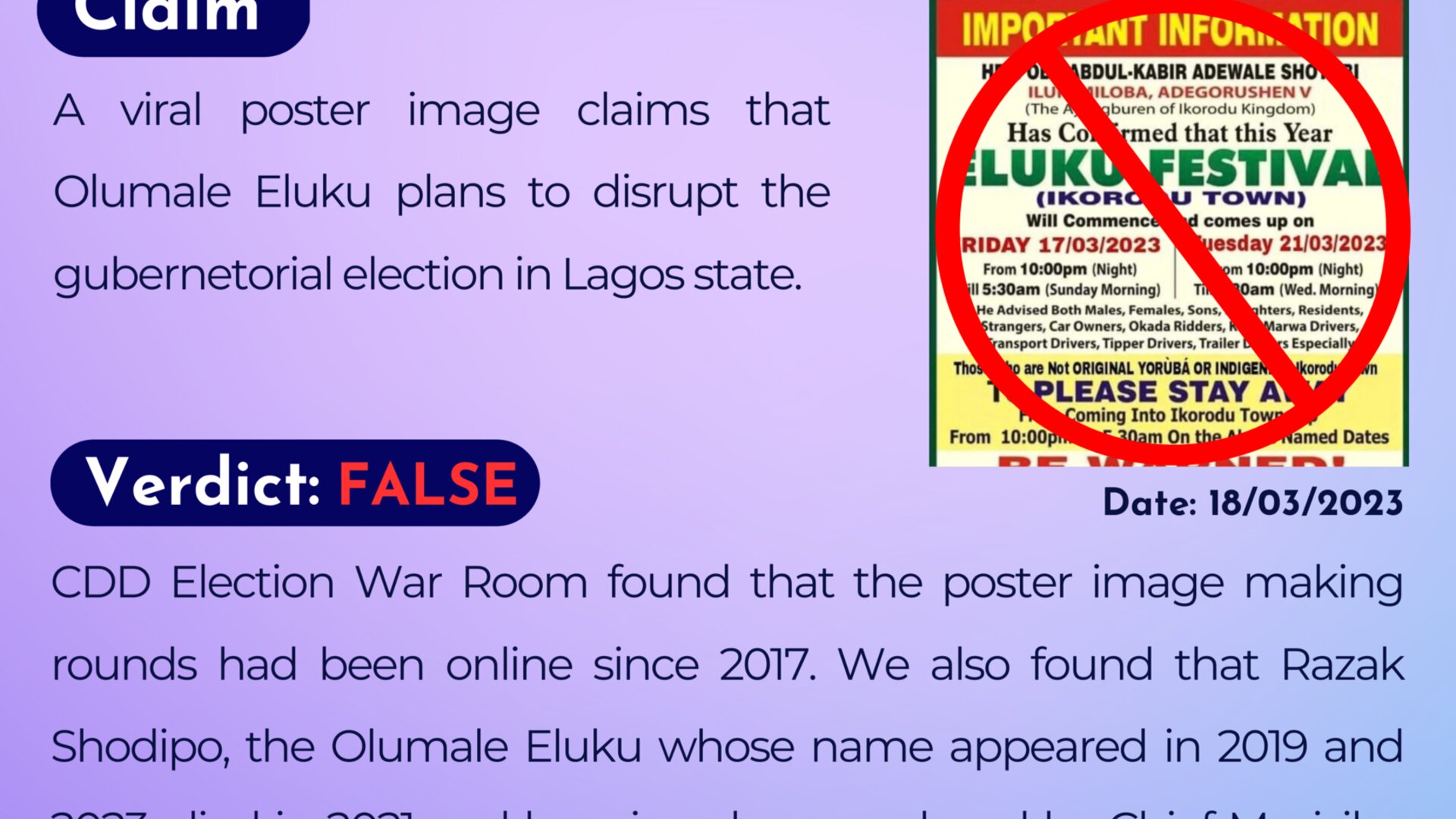 A viral poster image claims that Olumale Eluku plans to disrupt the gubernatorial election in Lagos state.