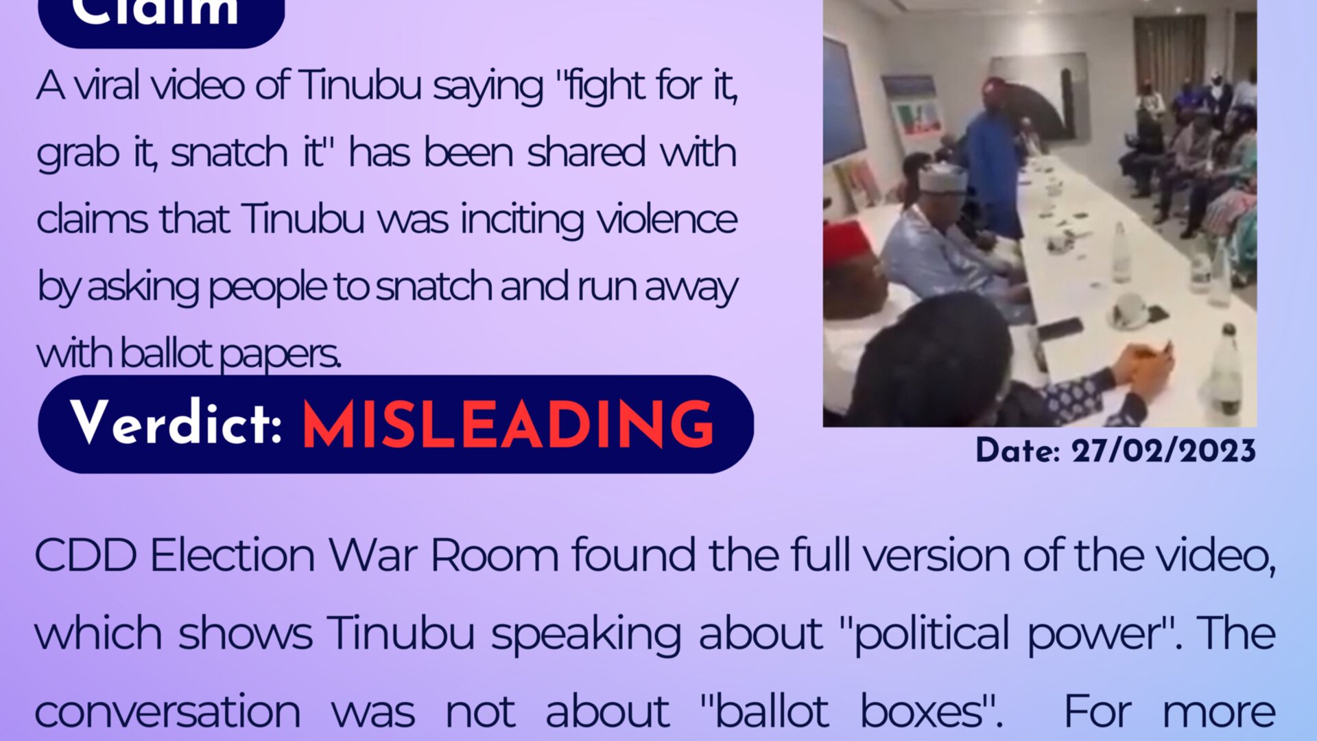 A viral video of Tinubu saying"fight for it, grab it , snatch it" has been shared with claims that Tinubu was inciting violence by asking people to snatch and run away with ballot papers.