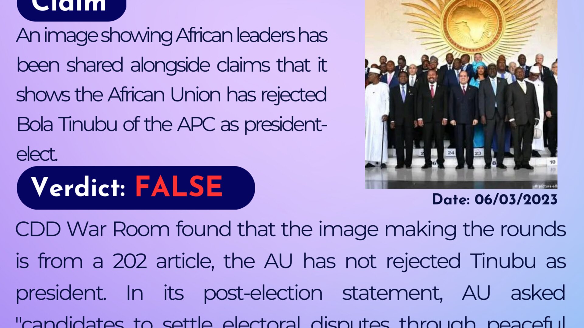 An image showing African leaders has been shared alongside claims that it shows the African Union has rejected Bola Tinubu of APC as president-elect.