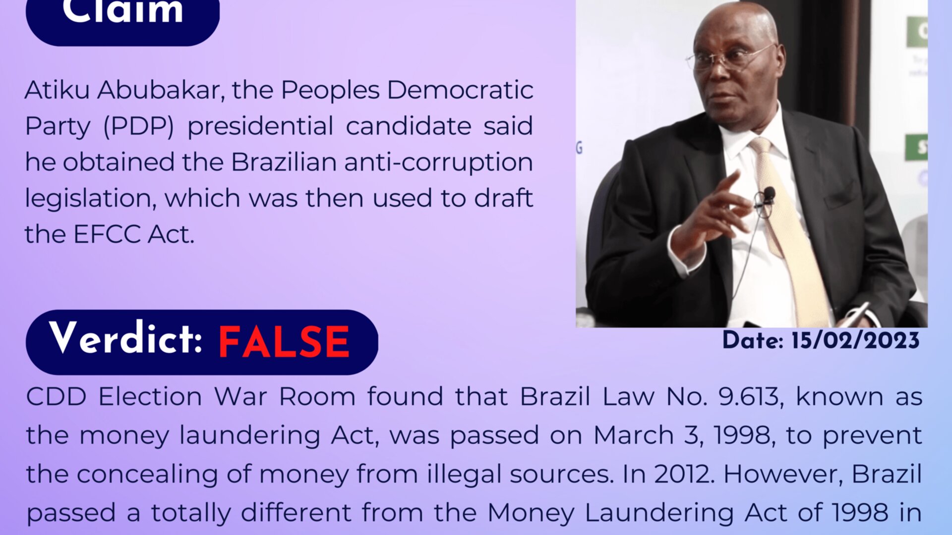 Atiku Abubakar, the Peoples Democratic Party (PDP) presidential candidate said he obtained the Brazilian anti-corruption legislation, which was then used to draft the EFCC Act.