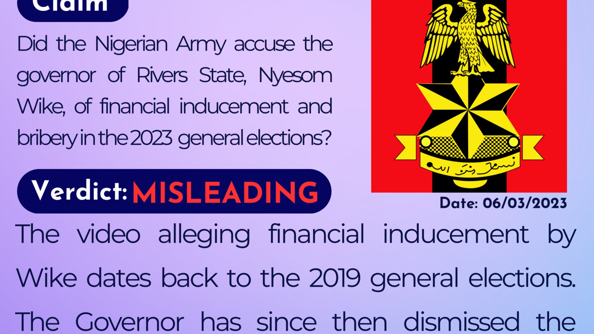 Did the Nigerian Army accuse the governor of Rivers State, Nyesom Wike, of financial inducement and bribery in the 2023 general elections?
