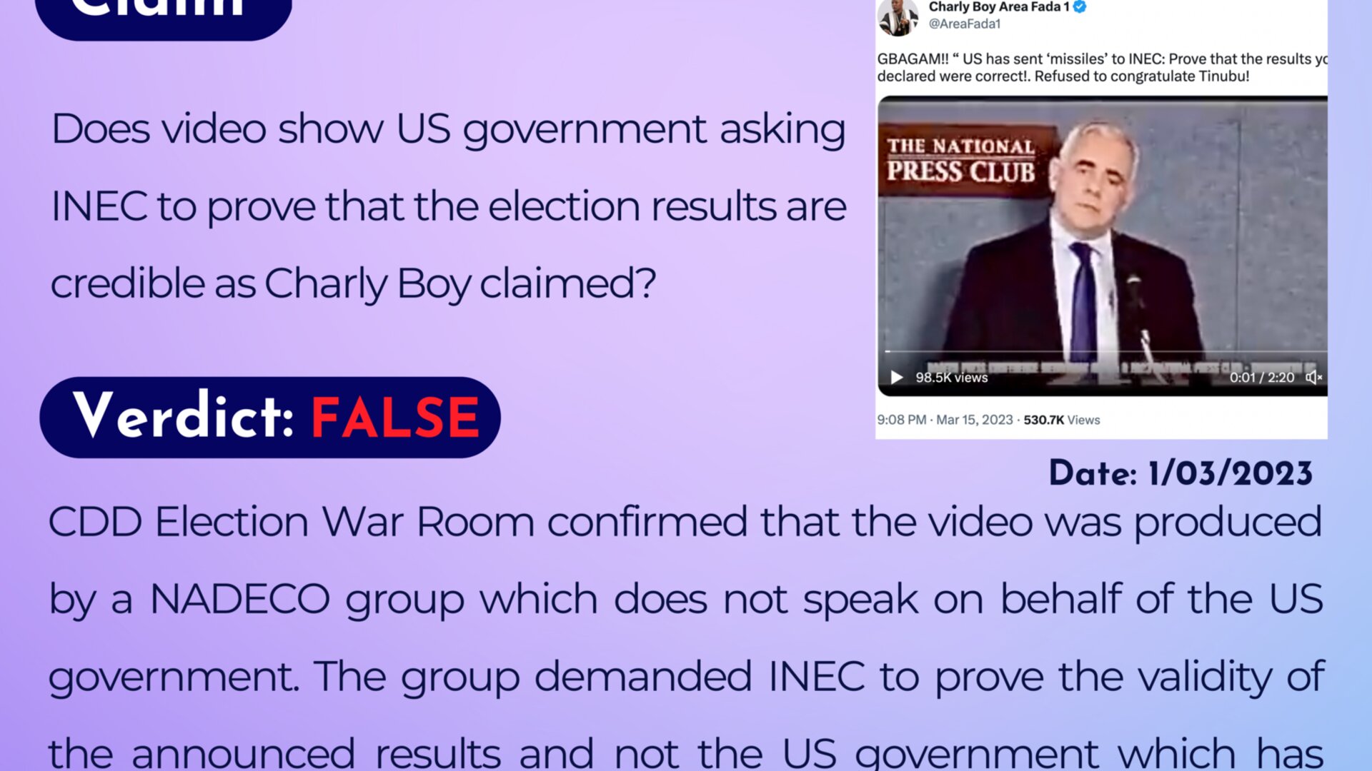 Does video show US government asking INEC to prove that the election results are credible as Charly Boy claimed?