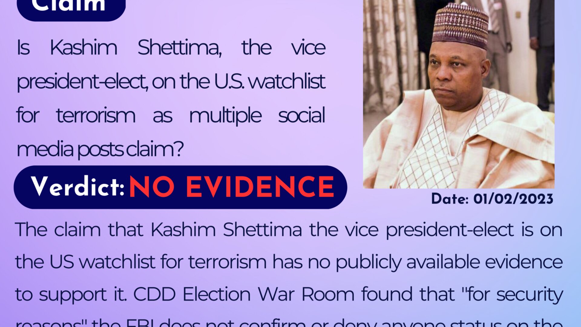 Is Kashim Shetimma, the vice president-elect, on the US watchlist for terrorism as multiple social media posts claim?