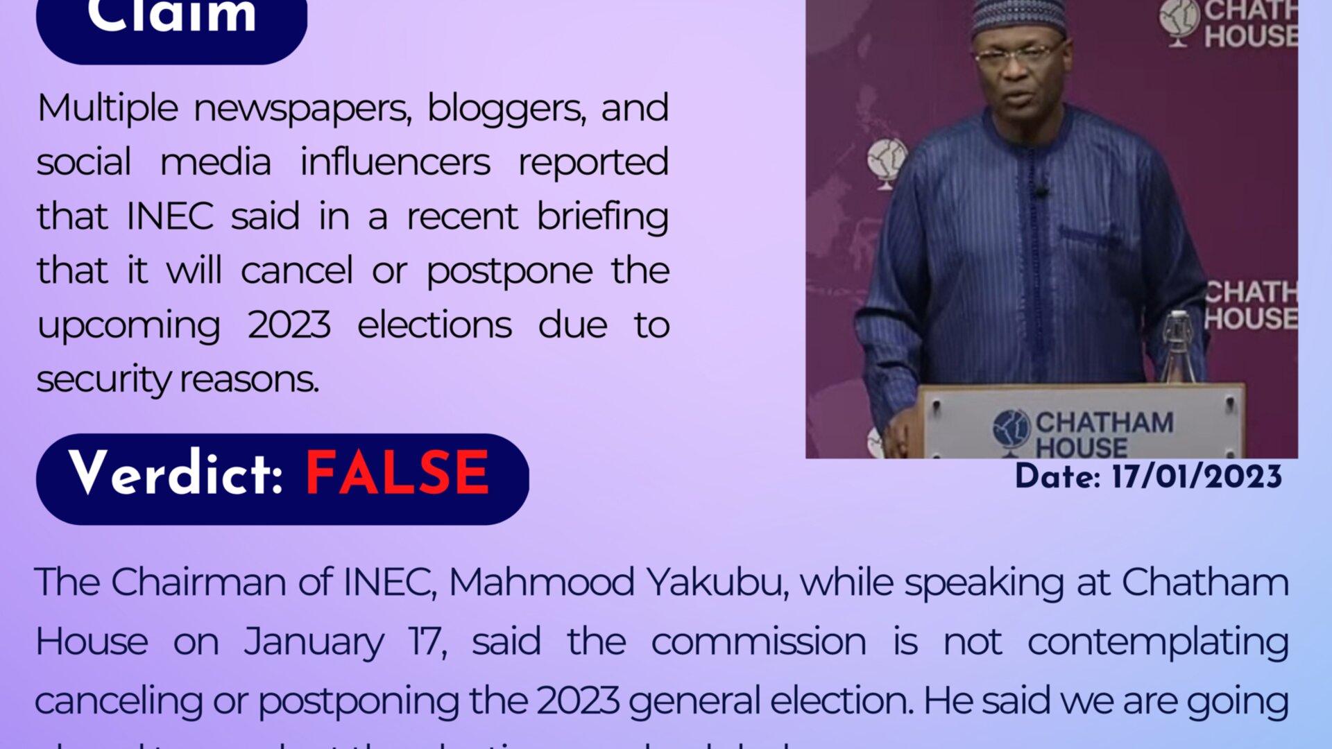 Multiple newspaper, bloggers and social media influencers reported the INEC said in a recent briefing that it will cancel or postpone the upcoming 2023 elections due to security reasons.