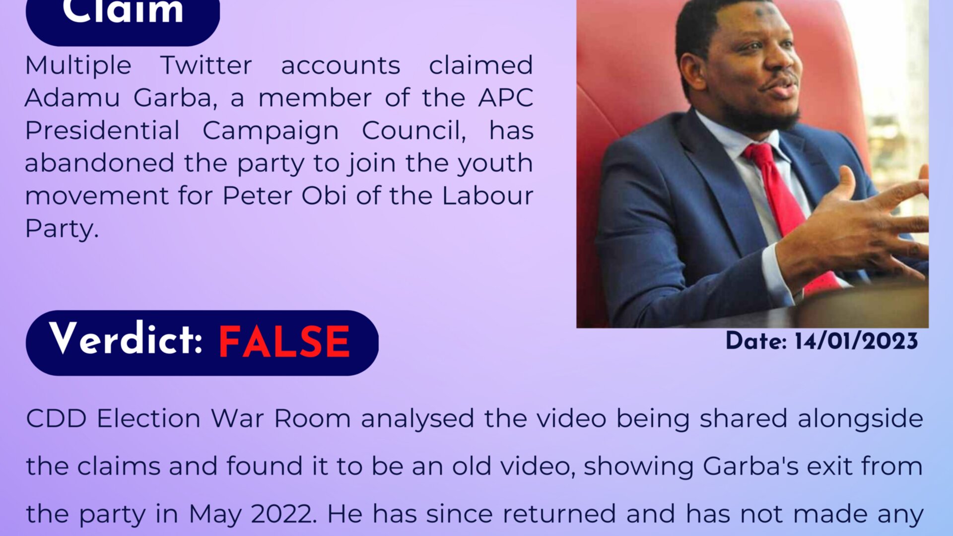 Multiple Twitter accounts claimed Adamu Garba, a member of the APC Presidential Campaign Council, has abandoned the party to join the Youth Movement for Peter Obi of the Labour Party.