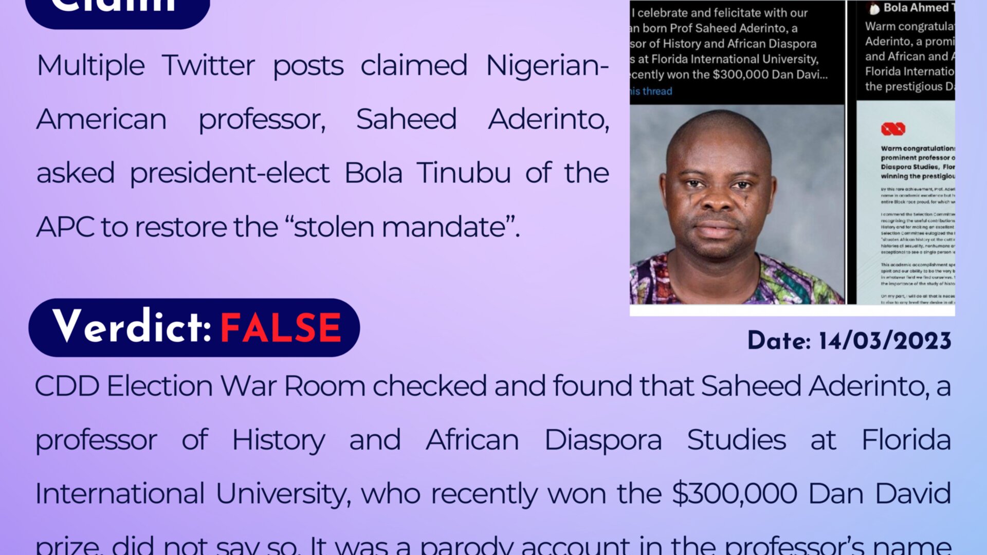 Multiple Twitter posts claimed Nigerian-American professor, Saheed Aderinto, asked president-elect Bola Tinubu of the APC to restore the "stolen mandate".