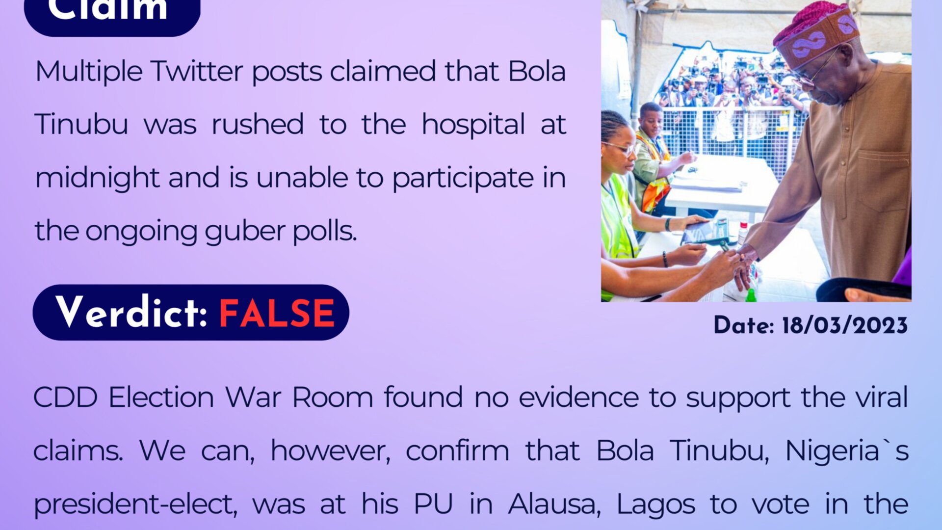 Multiple Twitter posts claimed that Bola Tinubu was rushed to the hospital at midnight and is unable to participate in the ongoing guber polls.