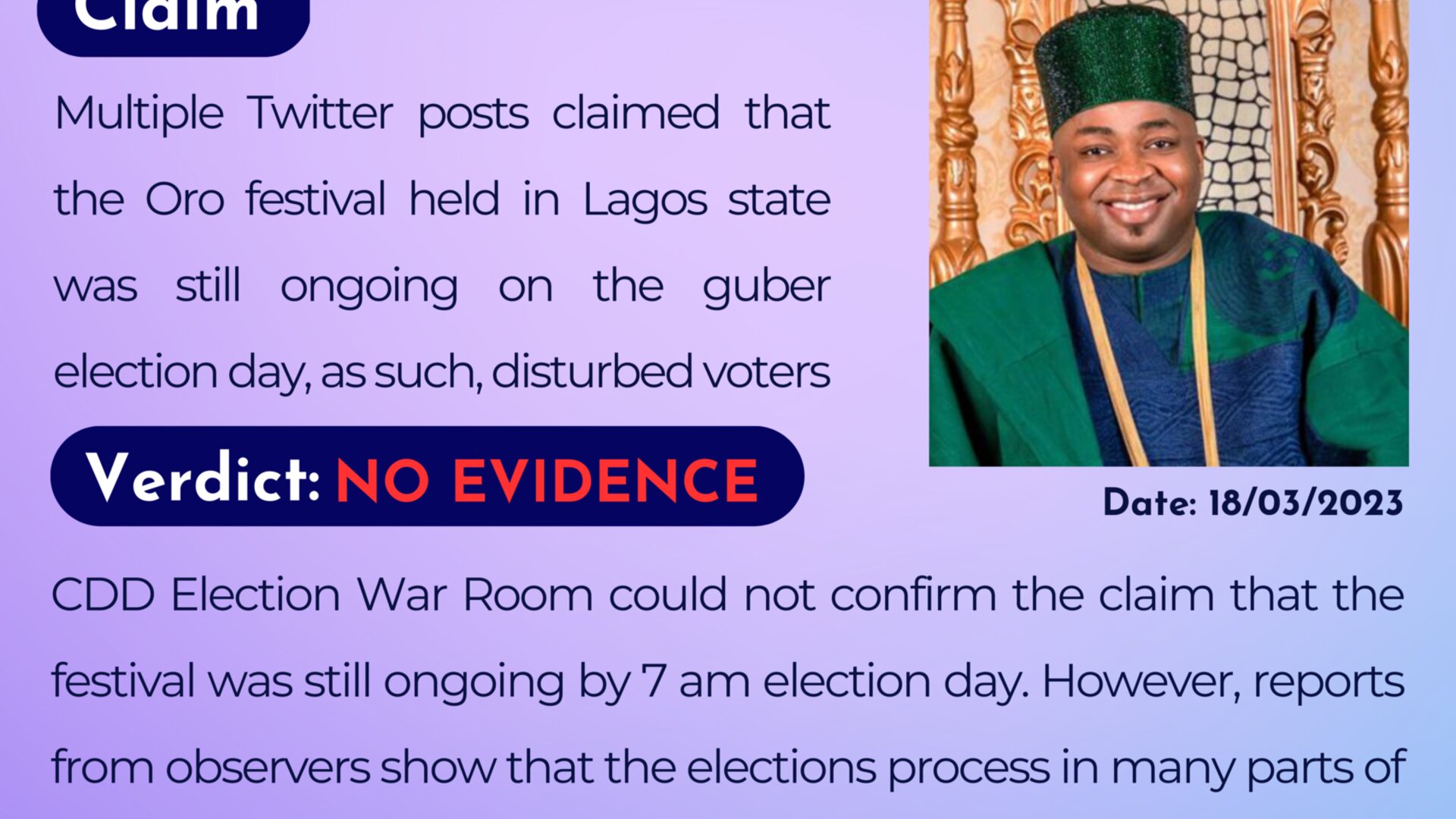 Multiple Twitter posts claimed that the Oro festival held in Lagos state was still ongoing on the guber election day, as such, disturbed voters.