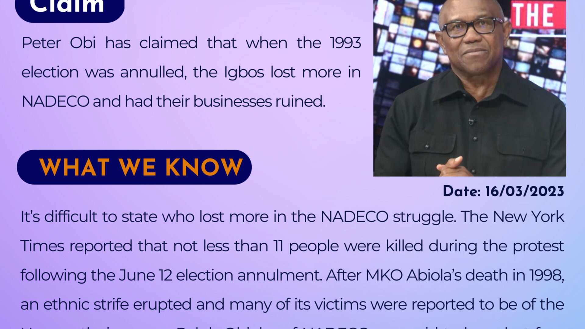 Peter Obi claimed that when the 1993 election was annulled, the Igbos lost more in NADECO and had their businesses ruined