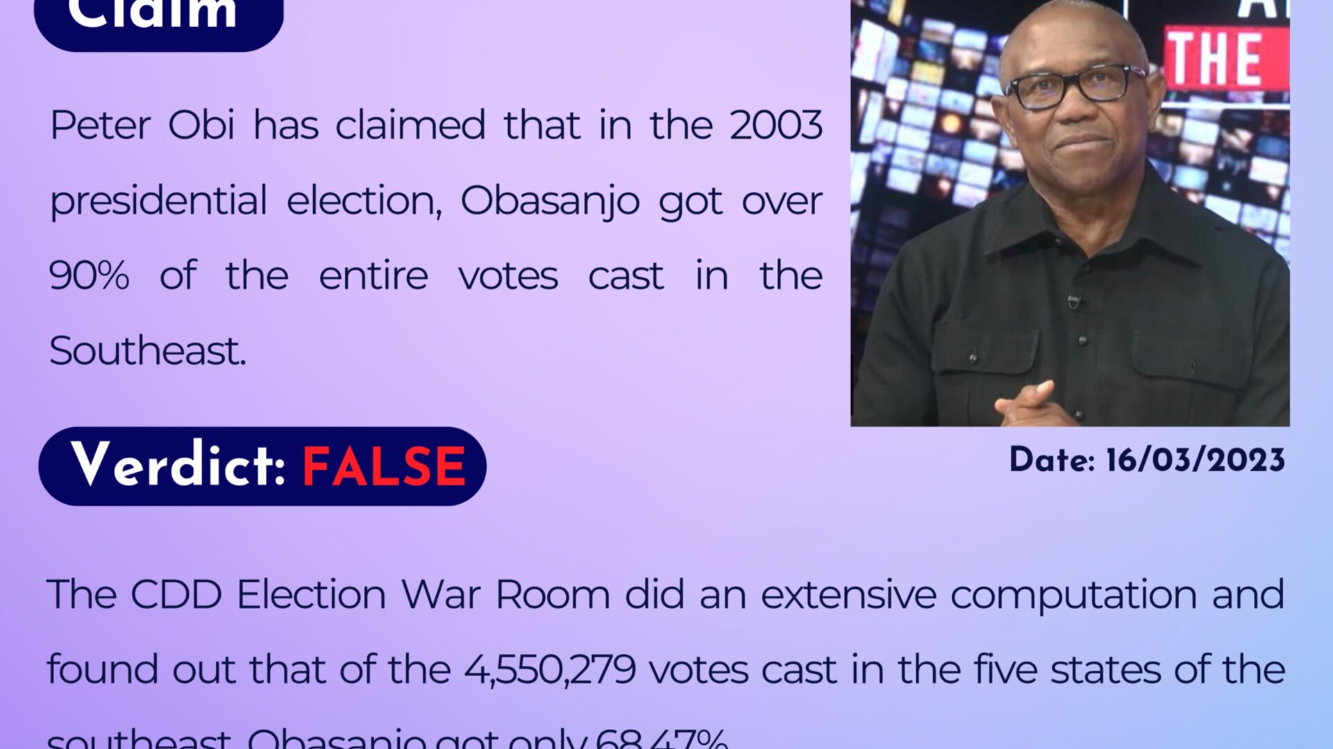 Peter Obi has claimed that in the 2003 presidential election, Obasanjo got over 90% of the entire votes cast in the Southeast.
