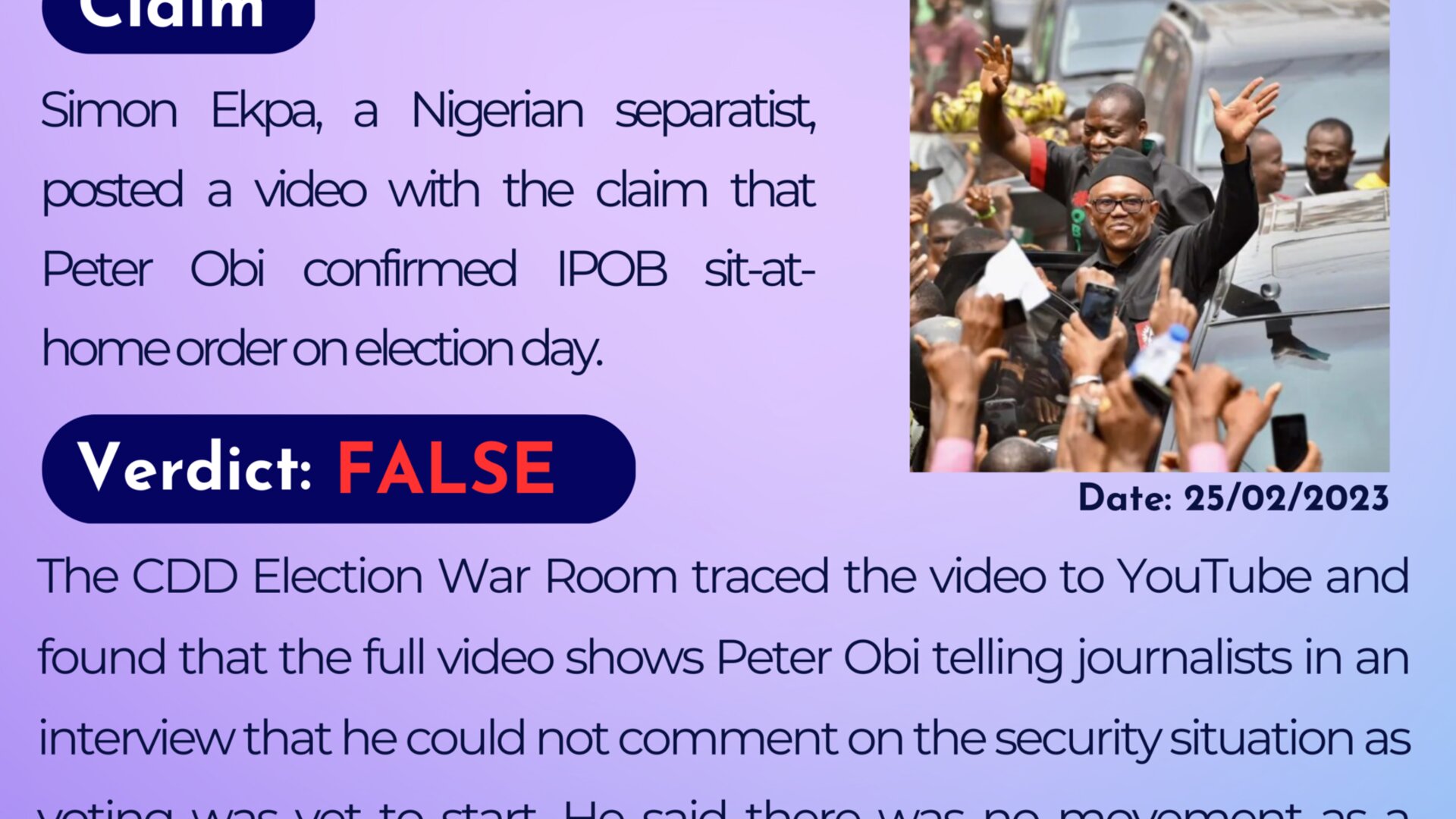 Simon Ekpa, a Nigerian Separatist, posted a video with the claim that Peter Obi confirmed IPOB sit-at-home order on election day.