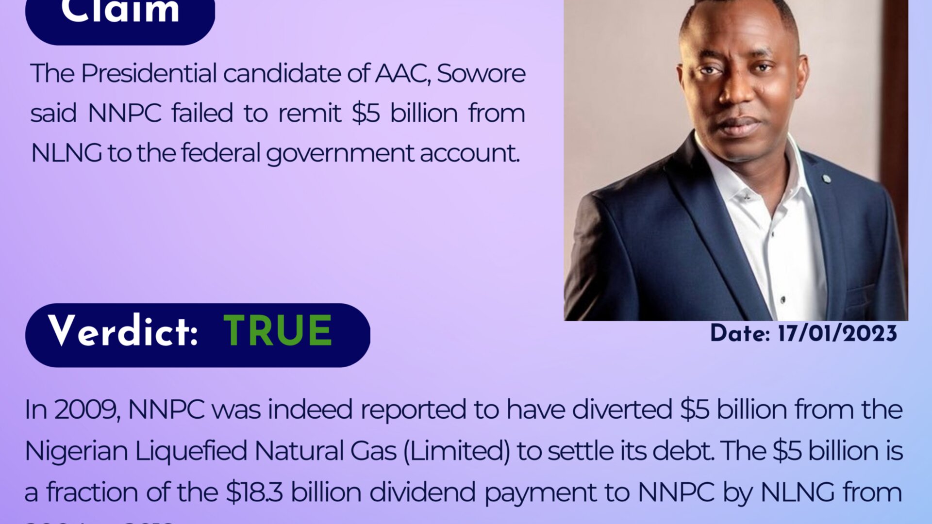 The Presidential candidate of AAC, Sowore said NNPC failed to remit $5 billion from NLNG to the federal government account.